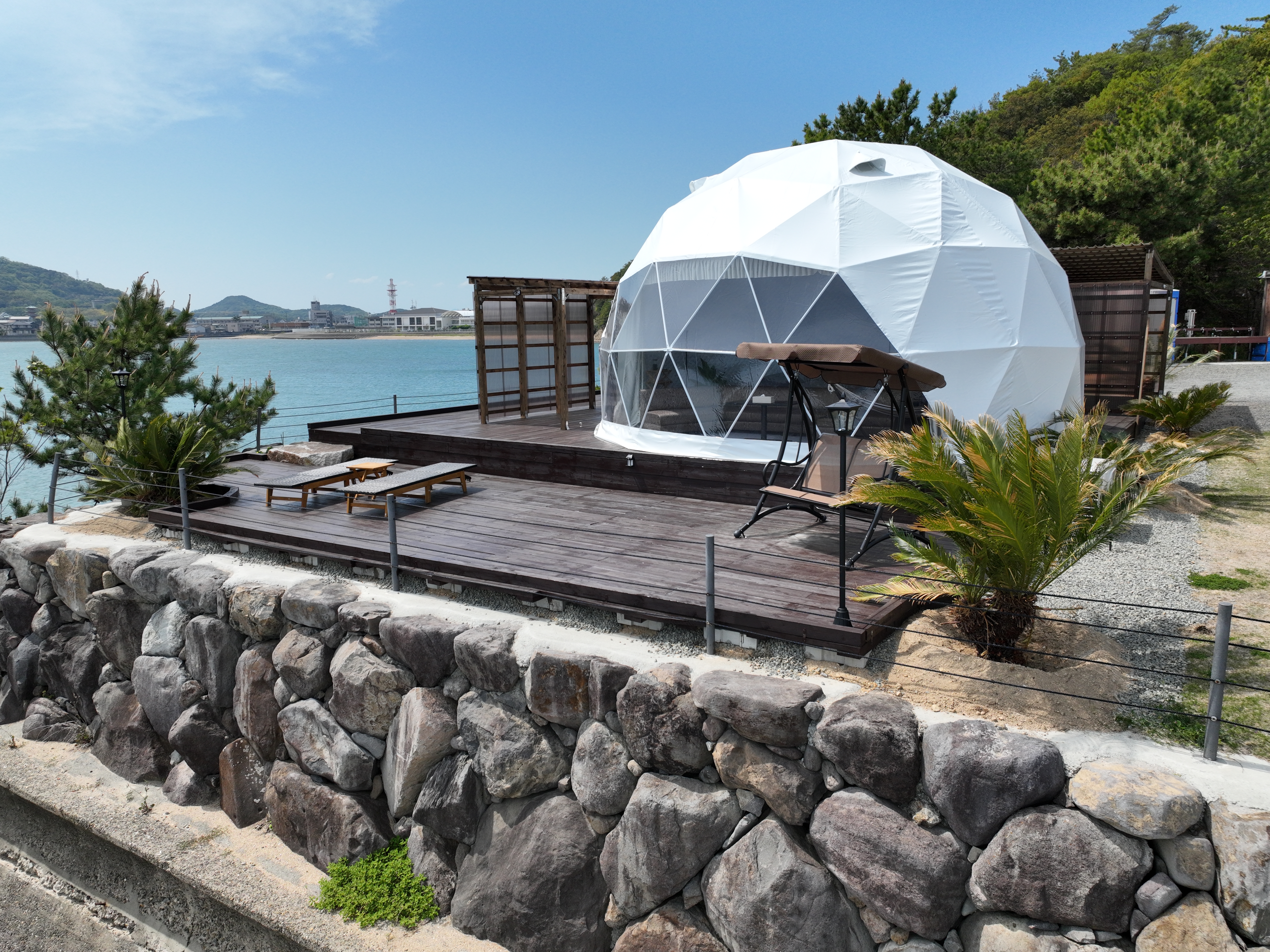 新設グランピングサイト誕生 ~ エンジェルサイト ~ 2025.05.01 2025年5月7日(水)より、ご予約を開始します。 ウッドデッキからはエンジェルロードが一望できより優雅で快適な空間をご提供できます。